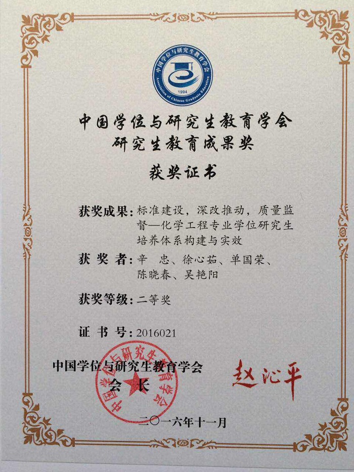 大会公布并表彰了第二届中国学位与研究生教育学会研究生教育成果奖。本届成果奖共有217项参评,经过形式审查、网络评议、复评答辩、审核批准等程序,共评出41项成果。新葡京官网副校长辛忠教授主持的、徐心茹等教授参与完成的《标准建设,深改推动,质量监督—化学工程专业学位研究生培养体系构建与实效》项目荣获全国二等奖。中国学位与研究生教育学会研究生教育成果奖于2014年设立,每两年评选一次,奖励在研究生教育理论研究与教育教学实践工作中开拓创新、做出突出贡献、取得显著成效的集体和个人。