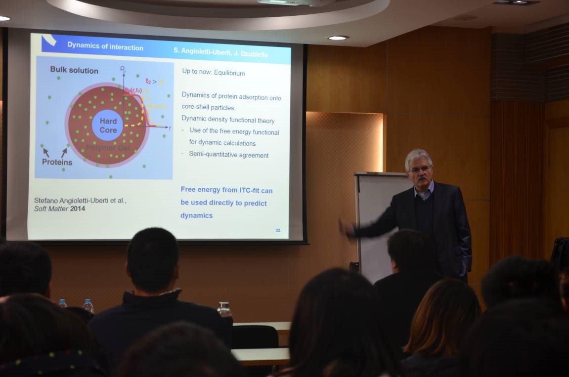 德国亥姆赫兹研究所柏林中心主任兼洪堡大学教授Matthias Ballauff和波兹坦大学陆琰(Yan Lu)副教授应新葡的京集团4321郭旭虹教授邀请于3月15日来新葡京官网访问。Ballauff教授在实验16楼110为我院师生带来题为“Self-assembly of Proteins with Charged Polymers: Comparing experimental Data to Theory and Simulation”的学术报告(图1)。他的报告主要是关于聚电解质刷与蛋白质的相互作用,通过理论分析和计算机模拟,进一步加深了对其相互作用机理的理解。Ballauff教授丰富的知识和深入浅出的介绍,使新葡京官网师生受益匪浅。