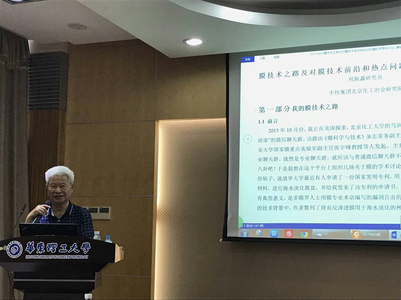 6月9日上午,中核集团北京化工冶金研究所祝振鑫研究员应邀来校访问,并在实验十六楼110室作了题为:“膜技术之路及对膜技术前沿和热点问题的思考和讨论”的学术报告。报告会由化学工程研究所所长许振良教授主持,浙江大学宁波理工学院雷引林教授、天津工业大学皇甫风云教授等教师与研究生70余人参加了报告会。祝振鑫研究员从他的出身、求学之路、工作之路和膜技术之路说起,分享了他的童年、中学和大学时代的轶事,以及工作后的心得体会,并重点讲解了他如何走上了膜技术的研发工作。同时,针对膜技术前沿和热点问题,祝振鑫研究员讲了自己的看法和观点。祝振鑫研究员风趣的讲话风格,热情洋溢的演讲感染了在场的研究生,并进行了热烈讨论与交流。此外,祝振鑫研究员与新葡京官网膜科学与工程课题组教师开展了技术交流。