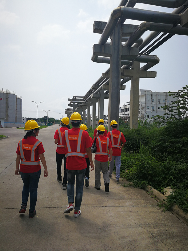 此后团队更是有幸亲临一线,参观了东材科技的聚酯薄膜、丙膜、油漆树脂等车间,并且参观了制作流程工艺中的两大步骤——切片与层压。车间主任给团队详细介绍了每个装置的用途和整个工艺流程,团队成员也就自己在实验室中学到的知识和车间主任进行了探讨,得到了车间主任对于学习化工的建议。