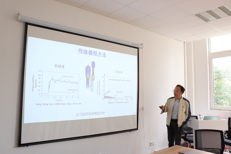 会议首先邀请了中国科学院过程工程所的葛蔚教授做专题报告。葛教授结合其团队的实验成果,从如何认识多尺度结构,模拟计算相比于传统实验的优势,多尺度结构对模拟计算的挑战,以及列举应用于不同领域的模拟实例等多个方面,深入浅出地向大家展示了模拟计算的概况和进展。葛教授精彩的报告激发了老师们对于模拟计算的更多方面的思考,报告后,他与青年教师们展开了热烈的讨论。