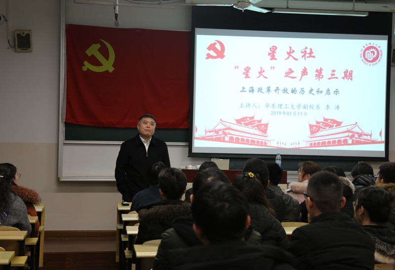 为了切实推进习近平新时代中国特色社会主义思想 “三进”工作,提高研究生骨干的思想道德素质和综合能力。1月11日下午,新葡的京集团4321研究生骨干系列培训活动暨 “星火之声”第三期在七教101室隆重开讲。党课特别邀请到新葡的京集团4321副校长李涛以《上海改革开放启示录》为题,给研究生党员骨干全面介绍了上海市改革开放的历史脉络,为同学们梳理出一幅“上海——时代中奋进”的蓬勃图景,给大家带来了关于学习领会海派历史中艰苦创业,曲折发展,辉煌成就的精彩一课。学院部分教工党支部党员也一起聆听的讲座。院党委副书记高艺霞主持了本次党课。