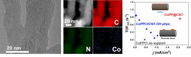 含有非贵金属中心(铁、钴、镍等)的卟啉及其衍生物可以高选择性地将CO2转化为CO,而基于此类活性物种的负载型催化剂在制备过程中极易形成分子间π-π堆积,从而导致严重的催化剂聚集现象。为了解决该问题,新葡京官网科研团队发展了一种利用共价键锚定卟啉分子的制备方法。研究人员在碳纳米管上引入羟基(-OH)、在卟啉分子轴向引入氯基(-Cl),通过取代反应将卟啉固定至碳纳米管表面。研究表明,卟啉分子与碳纳米管以共价键结合,并基本实现了单层分散,表现出极高的CO2电催化活性和CO选择性,解决了该催化体系研究中高负载量与高分散度不可兼得的难题。