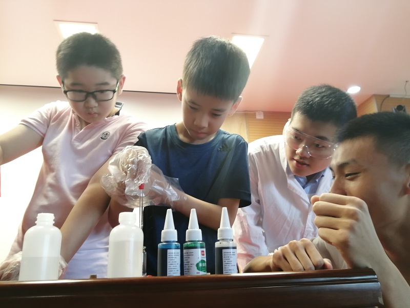 在保证安全的前提下,队员与小朋友们一同完成部分实验。每个实验结束后都会由专门的实践队员为大家解释实验原理,介绍相关仪器的使用方法。小朋友们热情高涨,积极参实验过程,感受奇妙的科学世界。