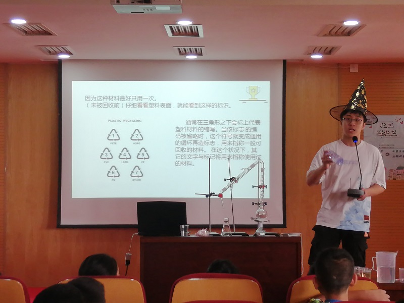 首先,团队成员为小朋友们讲解相关化学知识,由浅入深以水分子、多肽分子等等为例为大家介绍了“分子”这个化学的基本概念。接着简单介绍了化工在服装、餐饮、化肥方面的应用,列举身边常见的塑料制品,如矿泉水瓶、塑料餐具、塑料水杯等等为小朋友们详细介绍并区分了六种可循环塑料,又说明了不同的塑料使用时的不同注意事项。