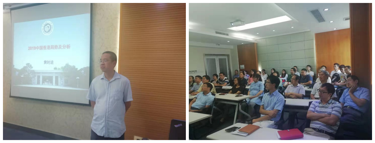 针对当前香港发生的一系列乱港反中暴力违法行为,为了能够让大家更清楚的了解香港乱局的由来和本质,揭露乱港分子和西方反华势力的一些不可告人的政治目的,9月20号中午新葡的京集团4321联反所、石加所和研究生三个党支部共同邀请了马克思主义学院科技与社会研究所所长黄时进教授在实验16楼610室一起参加了党组织生活交流活动,并由黄时进教授给大家作了题为“2019中国香港局势及分析”的报告。共计36名党员参加了此次组织活动。