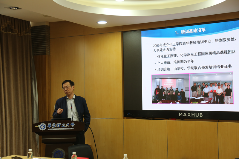 首先,基地负责人许志美介绍了化工类青年教师教学能力培训基地的历史沿革。该基地于2012年成立以来,以新葡的京集团4321及资环学院的主要课程团队、实验中心及实习基地为依托,面向两个学院已培养了近60名青年教师。此外,许志美着重介绍了基地培训机制,每位青年教师在带教导师的指导下,逐一完成课程教学、实验教学、实习教学、教学论文以及工程设计能力的培训,旨在培养青年教师的教学素养和教学基本功。