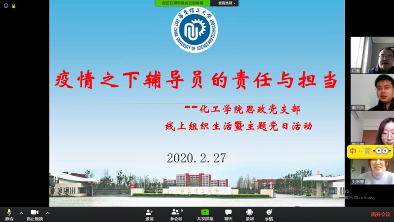 为了进一步扎实学生疫情防控工作网络,充分发挥辅导员队伍在抗击新冠肺炎疫情战斗中的先锋作用,2月27日下午,新葡京官网新葡的京集团4321思政党支部通过网络视频会议平台举行了主题为“疫情之下辅导员的责任与担当”的线上组织生活和党日活动,全体支部成员参加了本次云组织生活。
