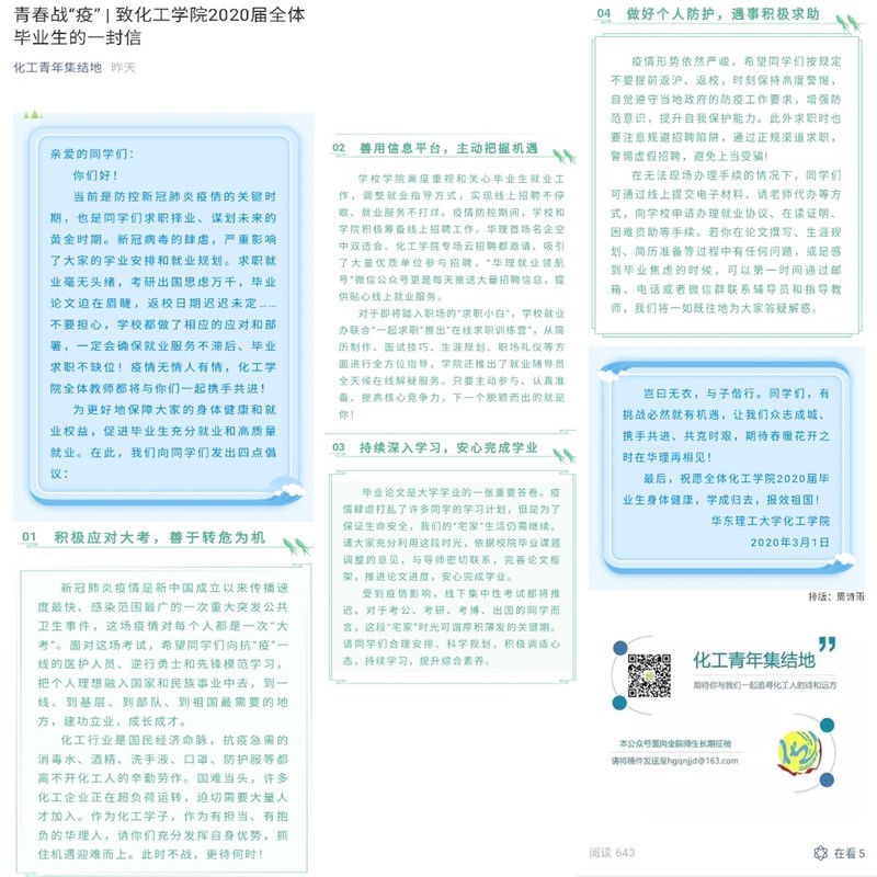 据了解,新葡的京集团4321高度重视和关心毕业生就业工作,实现线上招聘不停歇、就业服务不打烊。2020年2月28日,新葡的京集团4321成立2020届毕业就业工作领导小组、新葡的京集团43212020届毕业就业工作组及新葡的京集团4321学生党员先锋促就业小组,全员、全方位开展毕业生就业指导和帮扶工作。3月1日发布《致2020届全体毕业生的一封信》,鼓励同学们开启一段“隔屏不隔情·相隔不相忘”的求职之旅,共同打赢这场没有硝烟的疫情防控战役!