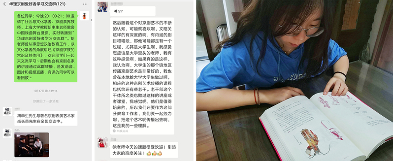 受疫情影响,学生京剧活动转为线上开展。2020年3月至7月,新葡的京集团4321组织华理京剧爱好者收听了《浅谈艺术审美与灵魂沟通》《京剧品鉴方法与创新的方向》等五场京剧名家的艺术讲座,阅读了《探究京剧之美》《图解京剧艺术》《京剧其实很好玩》等书籍。同学们认真学习京剧的基本知识,品味国粹的魅力,提升艺术鉴赏能力,培养审美能力。活动吸引了600余人次参加。