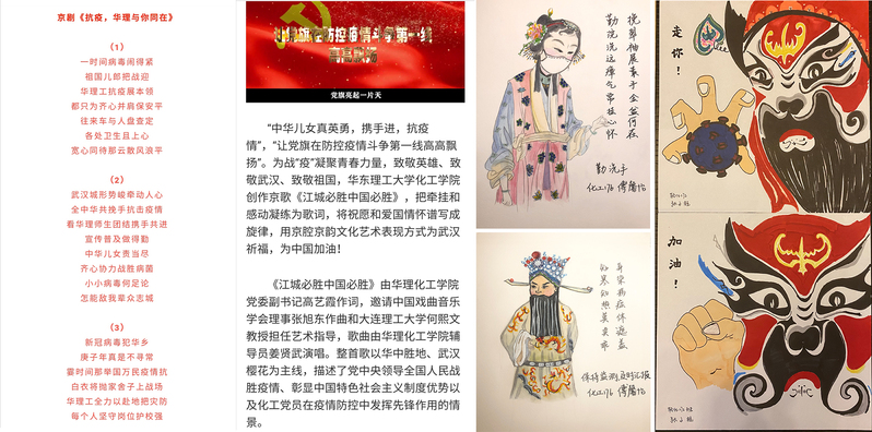 张子钰同学是一名名符其实的京剧爱好者,她曾在学校迎新晚会的舞台上表演京剧《梨花颂》。疫情期间,她拿起画笔创作了“加油”“走你”等蕴含京剧元素的绘画作品,为抗疫加油。傅馨怡同学则用京剧图画宣传“勤洗手”“戴口罩”,号召身边的人养成良好的卫生习惯。辅导员姜贤武带领京剧社的同学改编创作了京剧《抗疫,华理与你同在》和原创京歌《江城必胜中国必胜》,用文艺的力量为战疫凝心聚力。