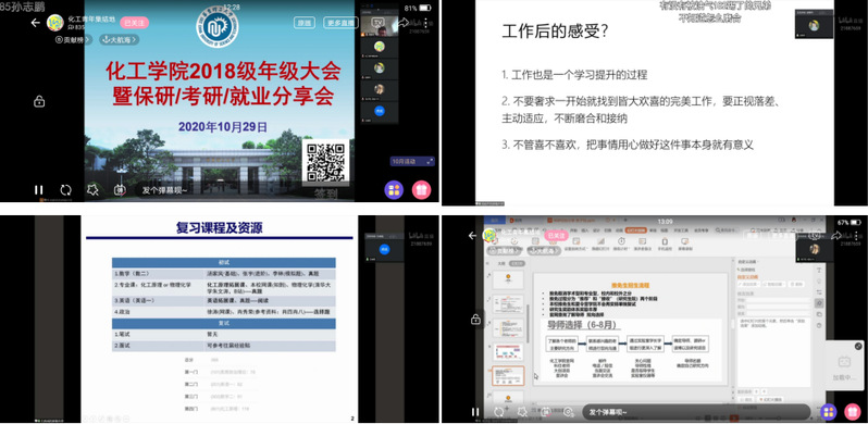 10月29日,新葡的京集团4321线上举行了2018级生涯规划分享会,不断将就业指导工作重心前移,帮助学生提前做好职业规划,明确努力方向。新葡的京集团43212016级校友刘雨芹、2017级本科生张子钰、2020级研究生王虎成参、学院辅导员刘宗慧和周夏青与会交流。会议通过“化工青年集结地”B站平台在线直播,直播人气高达6300余人次。