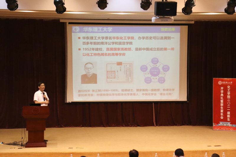 李春忠致欢迎词,对2021级新生加入化工大家庭表示热烈的欢迎,并从遇见华理、钟情化工、畅游学海、体悟成长四个篇章对学校、学科、学院和专业等作了详细全面的介绍。他希望所有2021级的学生志存高远,将个人的理想追求融入国家和民族的事业中,在华理收获感动,满载成长!
