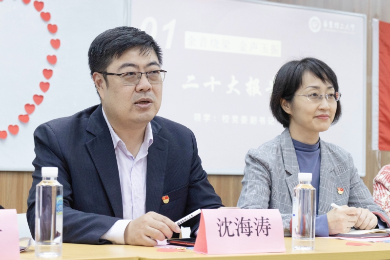 活动伊始,沈海涛从“内在逻辑”和“远景目标”两个视角入手,带领现场师生学习了党的二十大报告,深刻阐述了报告中“高质量发展”和原始创新、科技、人才、教育的关系。沈海涛寄语莘莘学子努力做胸怀梦想、脚踏实地的人,鼓励大家发挥专业所长,为高水平科技自立自强作出积极贡献,让青春在全面建设社会主义现代化国家的火热实践中绽放绚丽之花。