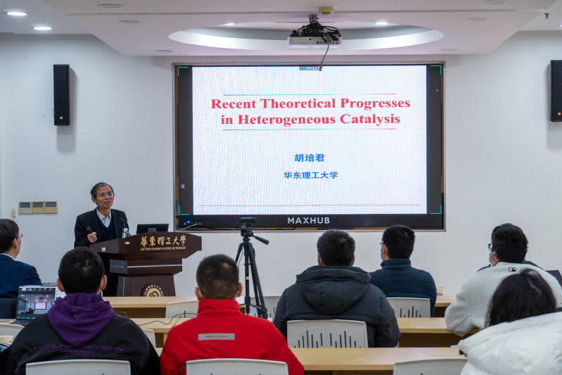 胡培君院士的报告从基于第一性原理的微观动力学模拟计算、非均相催化活性以及催化剂设计三个方面,介绍了他们团队在非均相催化基础理论和应用方面的先驱性工作。通过费托合成、酰胺加氢等典型反应案例,深入浅出地介绍了如何将催化基础理论、模拟计算方法应用于催化剂设计的创新性研究历程。报告引起了师生的热烈讨论,胡院士就电催化表界面理论、密度泛函理论模拟计算技术和宏观微观动力学跨尺度方法论等师生关心的热点问题逐一进行了解答,并以自身求学经历为例,勉励大家要勇立潮头,敢为人先,不断开展前沿性研究,为新葡的京集团4321高质量发展注入创新活力。
