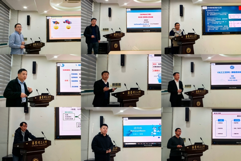 此次竞赛经过前期组织动员,共有11位教师报名参赛。他们参赛的课程内容包括大面积工程基础课程《化工原理》、专业核心课《分离工程》《化工工艺学》,也包括各个专业的选修课程。新进青年教师张翔主讲《智能与分子化学工程》课程,将人工智能引入逆合成分析,课程内容新颖,讲解生动有趣;产品工程系主任赵世成主讲《高分子科学基础》,授课功底扎实,将高分子聚合知识讲授得生动清晰,教学环节设计巧妙;刘振主讲了《化工工艺》课程思政建设,通过引入思政典型案例,在传授专业知识过程中厚植家国情怀,讲述华理人的“汗水哲学”。