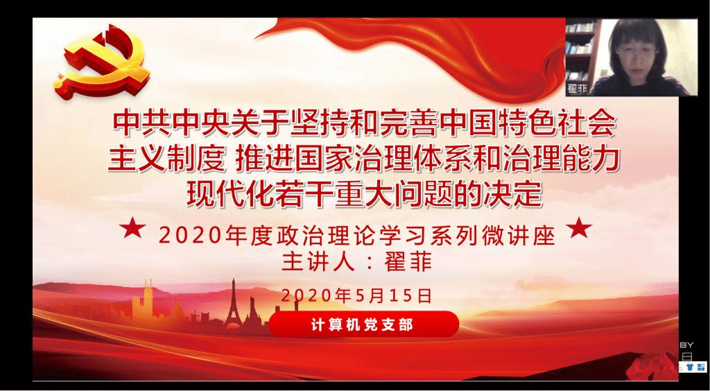 2020年5月15日,根据beat365在线唯一官网教职工政治理论学习要求及第二季度基层党组织“两学一做”学习教育安排,为保障疫情防控期间支部与教研室工作的正常进行,进一步提高教职工思想政治素质和理论水平,推进学校教育教学改革发展,计算机党支部和计算机教研室,立足本职、多措并举,充分利用线上多元化的方式,积极开展教职工政治理论云学习,为疫情防控时期,稳步推进教学科研工作提供强有力的思想保障和精神动力。会议由计算机党支部书记翟菲主持。郑小松、翟菲、张晓帆、宗东升四位党员教师分别以《习近平在全国教育大会上的讲话》、《中共中央关于坚持和完善中国特色社会主义制度 推进国家治理体系和治理能力现代化若干重大问题的决定》、《用新时代中国特色社会主义思想铸魂育人、贯彻党的教育方针落实立德树人根本任务》、《把思想政治工作贯穿教育教学全过程》为主题,为教研室全体教师讲授微党课。
