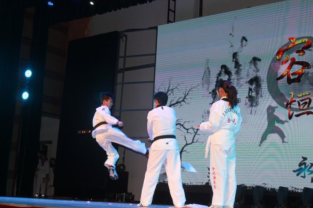 大风起兮云飞扬,威加海兮归故乡,安得猛士兮守四方!气吞山河的武术《大风起兮》令全场热血沸腾,武术协会剑光闪耀,双截棍表演刚劲有力,容恒跆拳道脚法卓越超群。