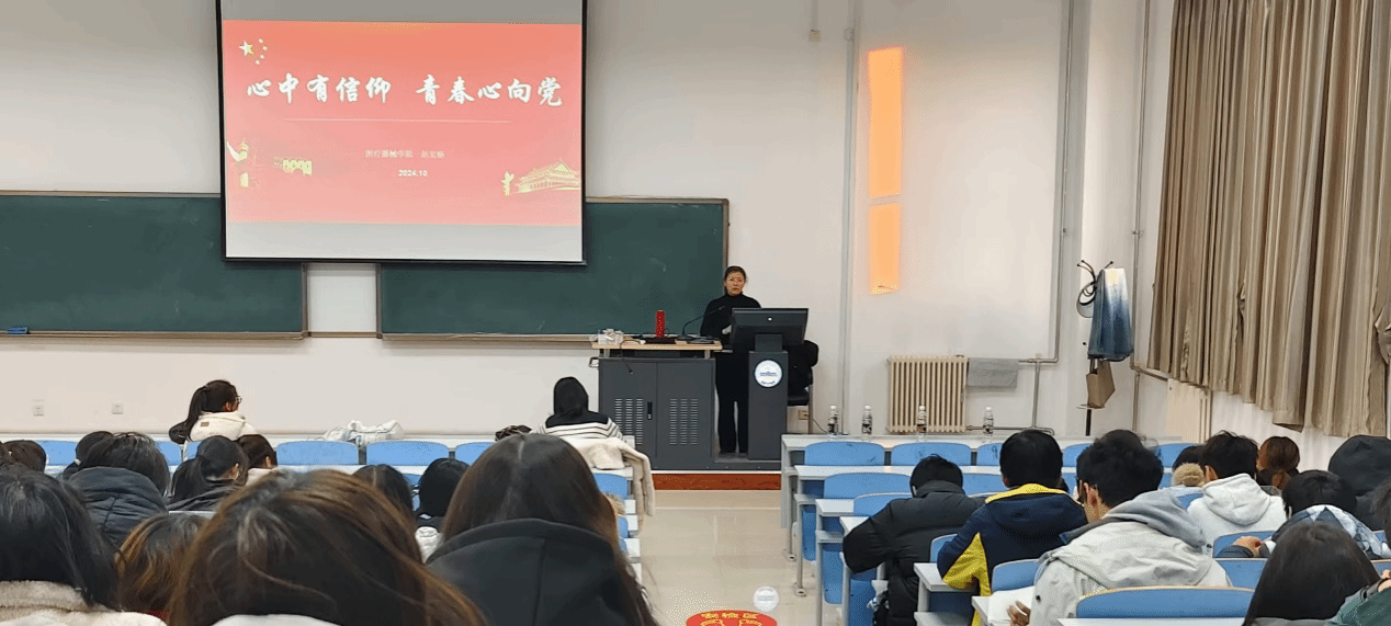 学院党委副书记赵宏格围绕“信仰的力量”、“中国共产党的初心和使命”、“身边的共产党人”、“大学生为什么要入党”四个方面内容为大家做了“心中有信仰 青春心向党”的主题报告。赵宏格从三十年代的方志敏讲到六十年代建成红旗渠,到今天科技创新新突破,列举一代代共产党人为国家富强、民族复兴、人民幸福前赴后继的伟大壮举,生动阐释了中国共产党“为中国人民谋幸福,为中华民族谋复兴”的初心与使命。赵宏格鼓励同学们要坚定信念,为理想奋斗,要心怀祖国,为民族奋斗,要努力学习,为祖国成就,要以德立身,为人生追求。