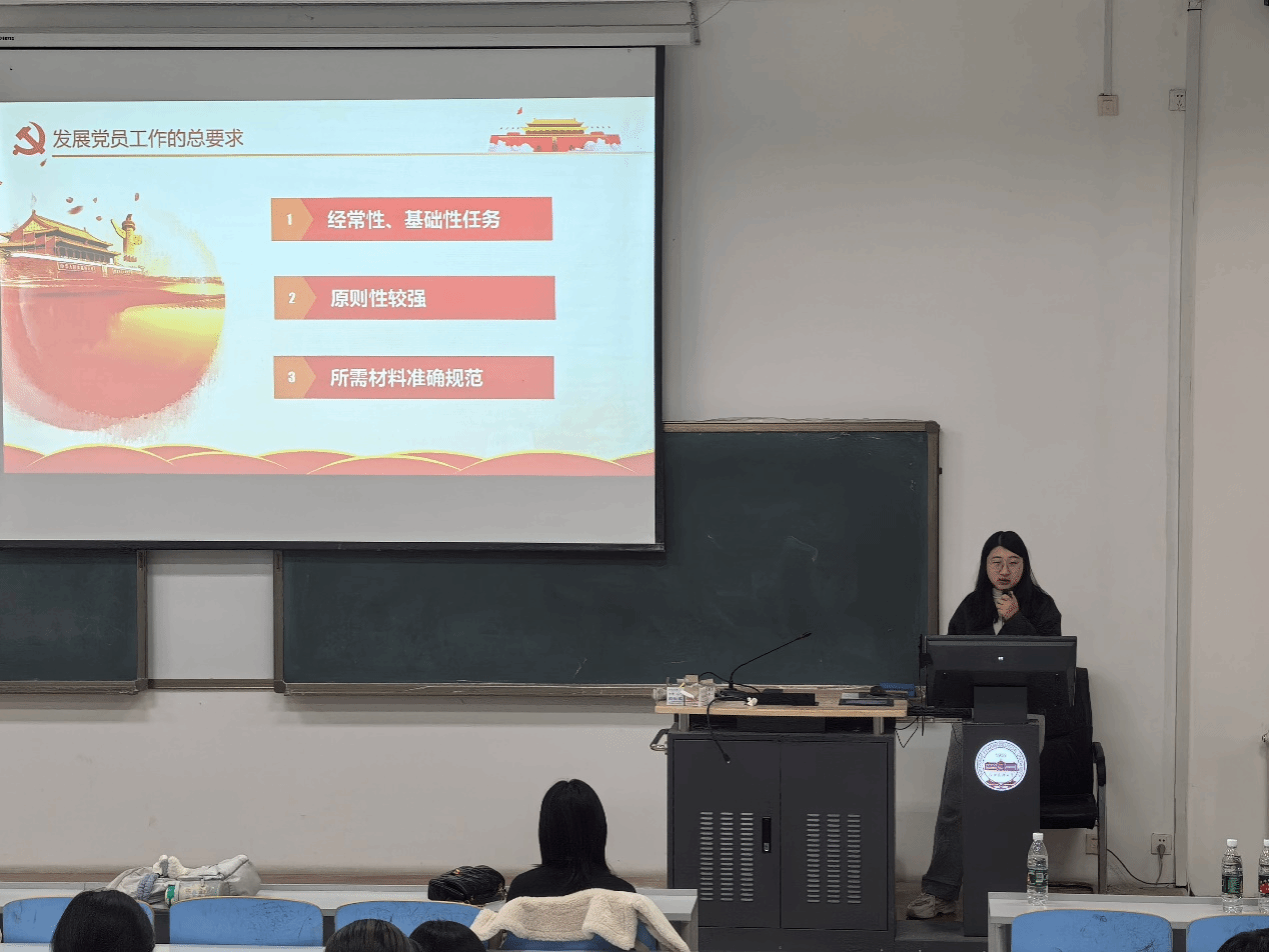 学院党委组织员朱辉向同学们介绍了发展党员流程,从递交入党申请书到成为正式党员,帮助同学们了解党员发展的详细步骤和重要意义。