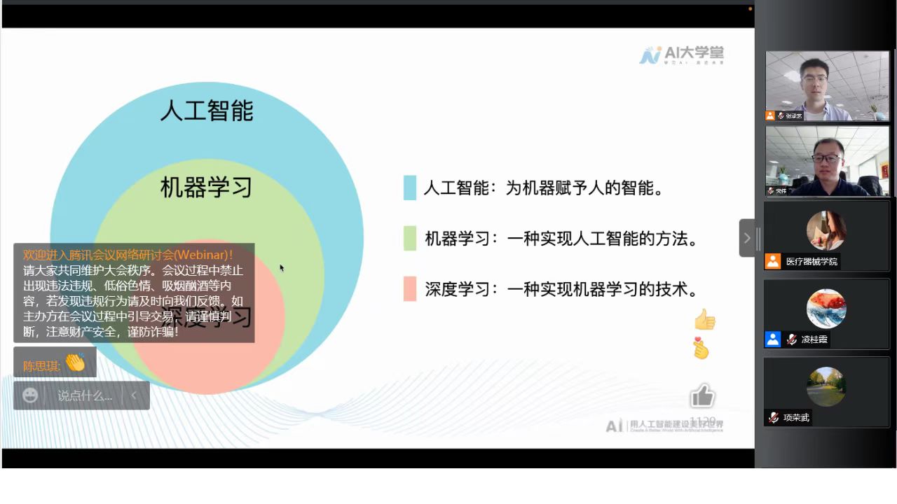 宋伟围绕人工智能发展概况、人工智能技术原理与应用场景,通过讲解机器学习的原理与发展历程、深度学习涉及的算法、机器学习系统的类型等知识,带领大家了解人工智能四大领域之一的机器学习,并分享了机器学习路径规划、资源分享与学习方式建议。在报告最后,科大讯飞的专家与在线的师生进行了交流与讨论,给广大师生提供了可借鉴的经验。