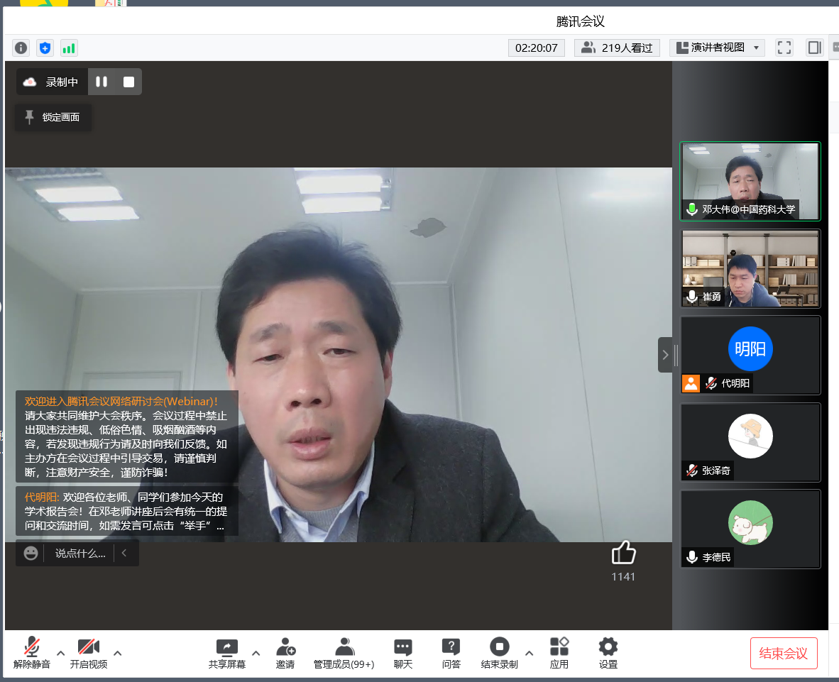 3月31日,由研究生院、辽宁省药学研究生创新与学术交流中心、beat365在线唯一官网联合举办的“沈药无涯论坛”第274讲——邓大伟教授学术报告会于线上如期举行。会议邀请到中国药科大学邓大伟教授做了题为《荧光量子点及其生物医学应用》的学术报告。报告会由beat365在线唯一官网副院长崔勇主持,200余名师生在线收看。