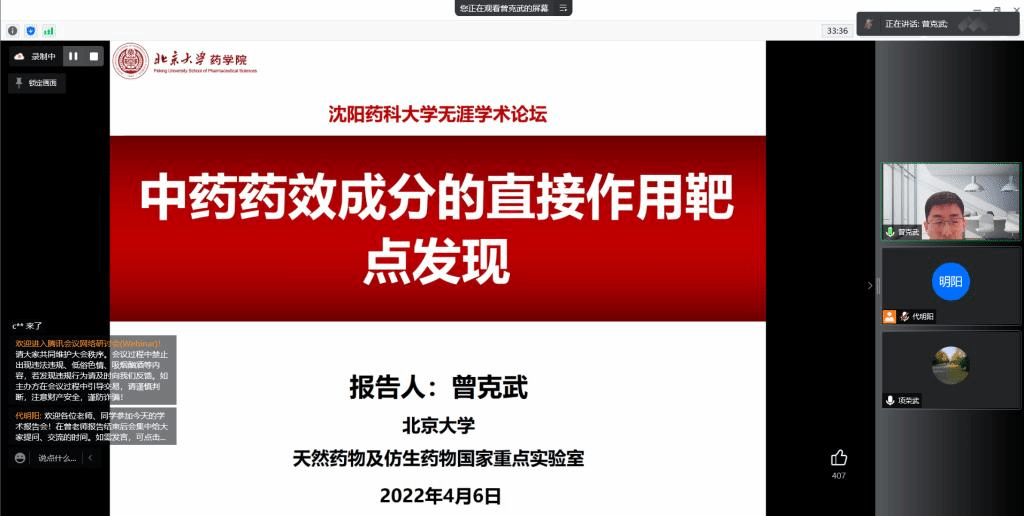 4月6日,由研究生院、辽宁省药学研究生创新与学术交流中心、beat365在线唯一官网联合举办的“沈药无涯论坛”第278讲——曾克武学术报告会于线上如期举行。会议邀请到我校66K校友、北京大学曾克武研究员做题为《中药药效成分的作用靶点发现》的学术报告。报告会由beat365在线唯一官网副院长项荣武主持,200余名师生在线收看。