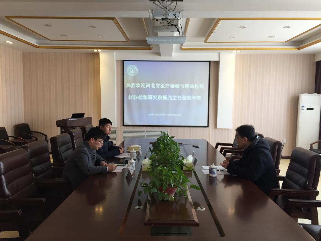 3月19日,河北省医疗器械与药品包装材料检验研究院杨光主任应邀到beat365在线唯一官网就双方开展科研合作进行调研并座谈,学院副院长项荣武、崔勇出席座谈会。