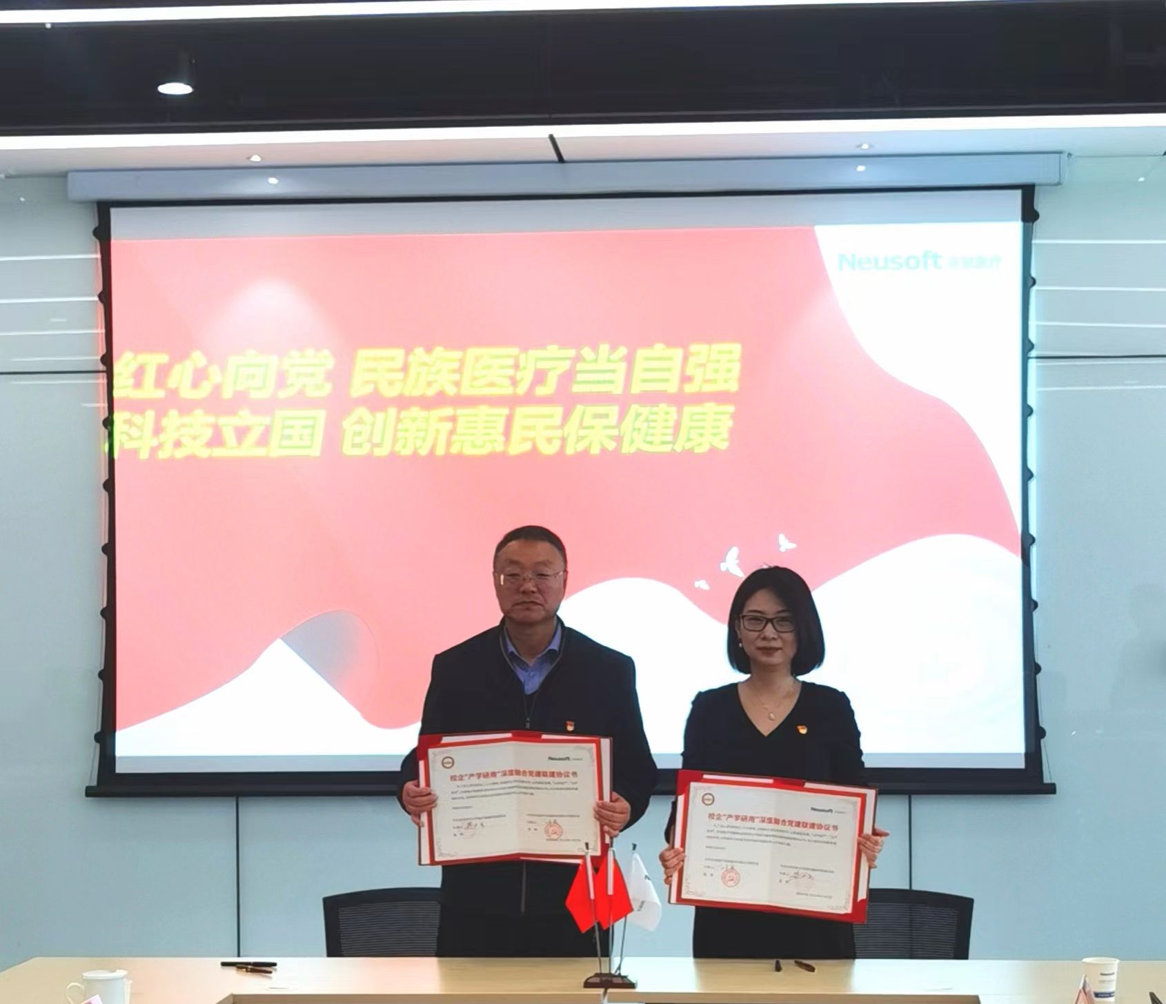 随后,学院党委和东软医疗党委签署了校企“产学研用”深度融合党建联建协议书。该协议的签署旨在依托校企“产学研用”深度融合,充分发挥共建实践教育基地各自优势的作用,共同推动医疗领域的发展,为医疗器械行业培养人才、促进科技创新和产业发展做出积极贡献。